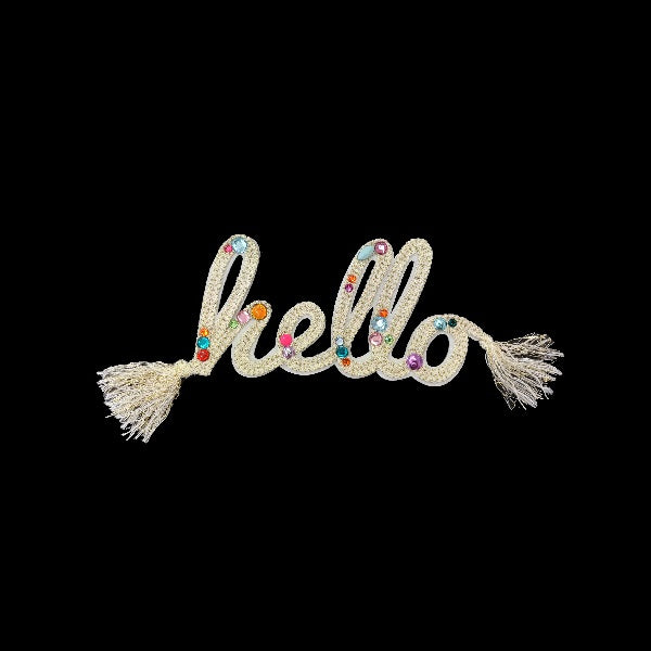 Toppa termoadesiva con scritta "hello" ricamata con pietre colorate termoadesive.