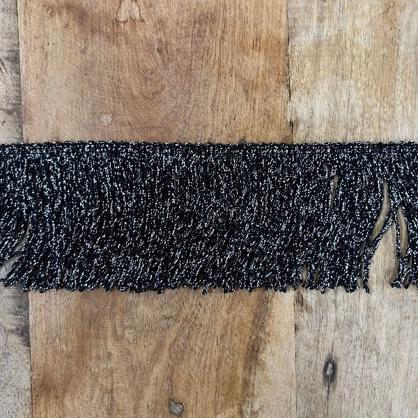 Frangia in tripolino lurex nero argento alta 7,5 cm tagliata.