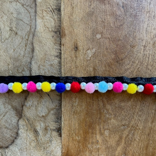 Passamaneria profilo pon pon colorati su base gros grain con perle