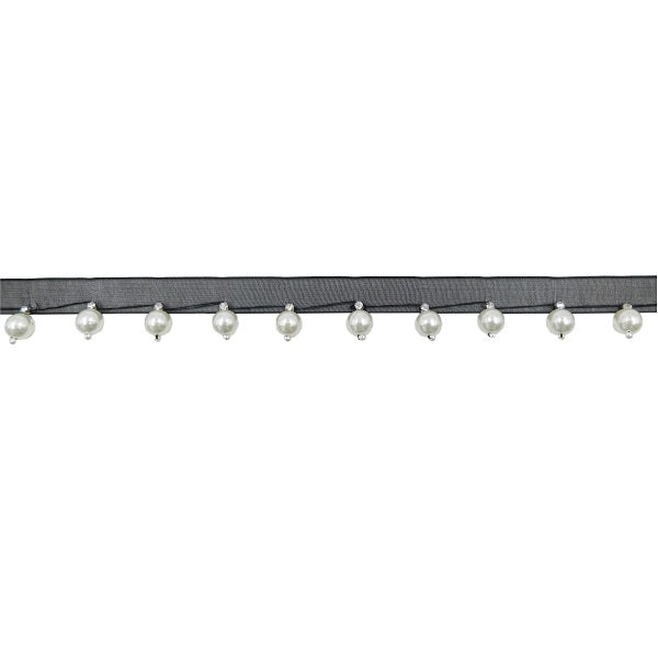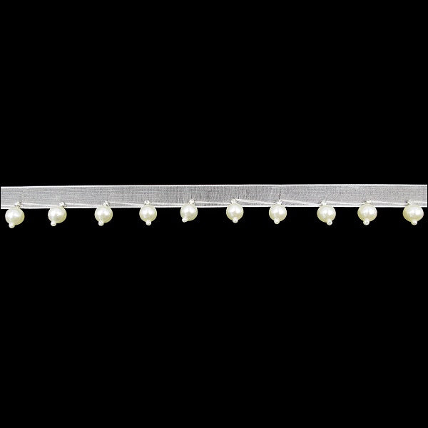 Passamaneria frangia con perle pendenti montate su base organza alta circa 1,5 cm.