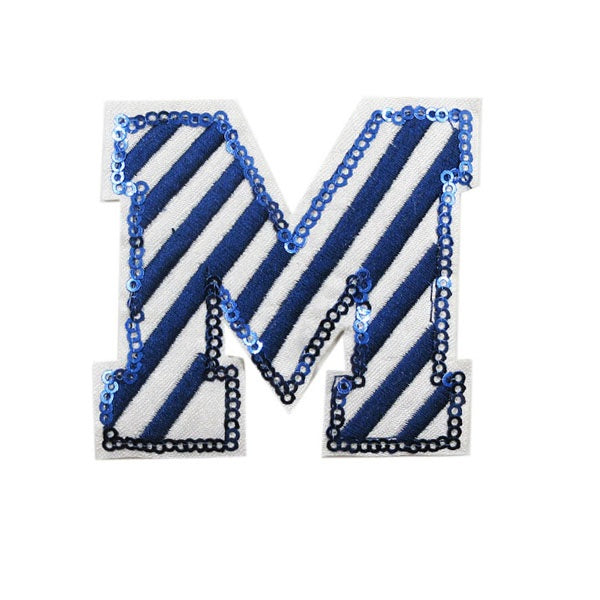 Toppa ricamata termoadesiva lettera M colore bianco e blu a righe con paillettes.